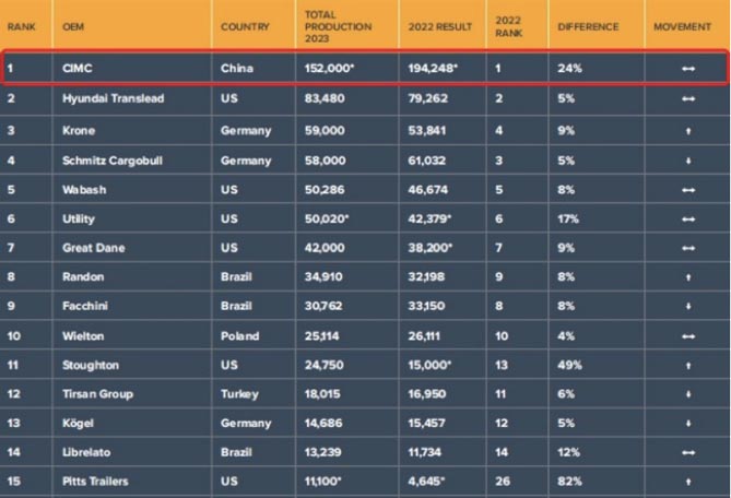 近日,全球半挂车知名杂志Global Trailer正式公布2023年全球前50名半挂车制造商按产量排名数据(2022年7月1日至2023年6月30日间)。作为榜单上唯一的中国企业,全球半挂车及专用车高端制造龙头中集车辆(集团)股份有限公司(以下简称“中集车辆