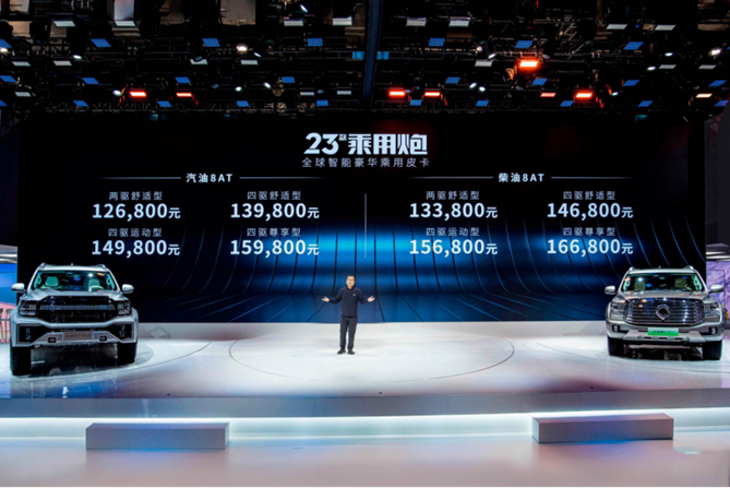 4月19日,全球智能豪华乘用皮卡2023款乘用炮,在上海车展正式上市。汽油版车型官方指导价为12.68万元-15.98万元,柴油版车型官方指导价为13.38万元-16.68万元。2023款乘用炮在智能、豪华、安全、舒适等方面再进阶,增配不加价,以冠军实力,在全