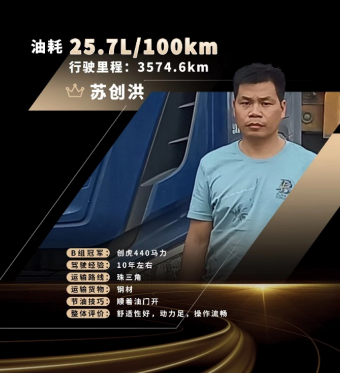 作为专注于长途运输的老司机、现代创虎的忠实用户,B组总冠军苏创洪在赛后接受采访时表示,在周排名中自己与周冠军仅差0.5升,通过调整驾驶习惯后竟然将成绩反超,兴奋之情难于言表。他将成绩归功于驾驶技能和车辆节油性能,并分享了个人节油“小妙招”。他说开车时不要猛踩油门,行车过程中要观察路况提前预判,换挡时转速一般控制在1100转左右,轻踩油门进行加速。此外,他对现代创虎也给予了高度评价。现代创虎的自动挡变速器具备的低阻条件行驶功能,遇到极端天气或者湿滑路面能有效防止轮胎打滑,确保安全性。此外,下坡时按下打开智能滑行功能,即可松开油门踏板,帮助用户省时省力,更省油。不止如此,在用车过程中,现代的售后服务也给苏创洪留下深刻印象,尤其在他成为创虎用户后第一次路遇事故,现代服务团队第一时间赶赴现场,整个处理过程非常规范且及时,帮助他以最短的时间重新投入运营,确保了运输的时效性。