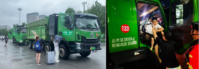在保定地区遭受特大暴雨的袭击之际,东风柳汽乘龙H5新能源渣土车同样化身“守护车”,解决了高铁站内一千多名因暴雨滞留旅客的燃眉之急。