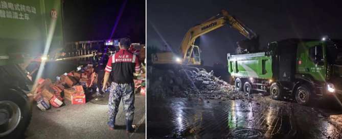 将乘客们安全送离后,乘龙H5新能源渣土车又立即投入到抢险修筑河堤、运送重要民生物资及渣土的工作中,有效保障了抗洪抢险救援行动的开展。