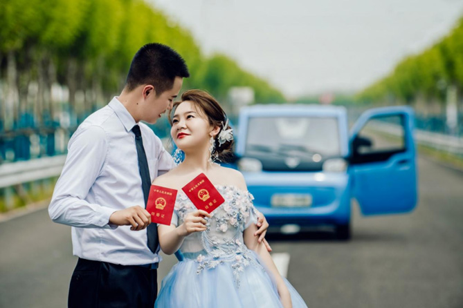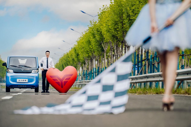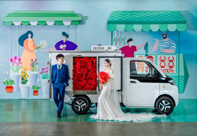 在几组新人发布的婚纱大片中,北汽雷驰新能源MINI卡集潮玩、时尚、科幻于一体。