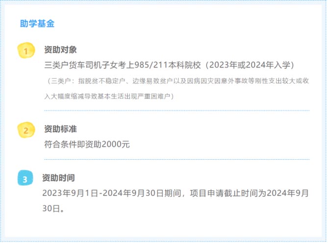“爱领航”助学基金:三类户(脱贫不稳定户、边缘易致贫户以及因病因灾因意外事故等刚性支出较大或收入大幅度缩减导致基本生活出现严重困难户)货车司机子女考上211/985本科院校,资助2000元/人。