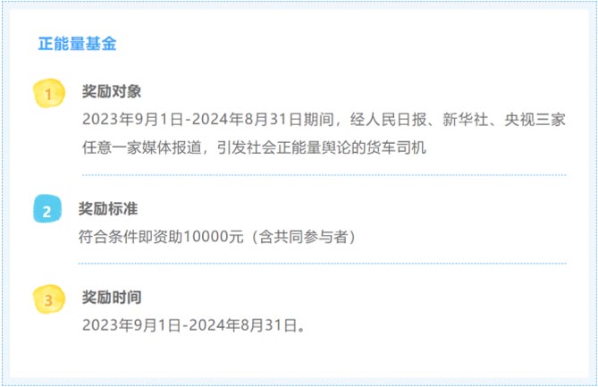 “爱领航”正能量基金:经人民日报、新华社、央视三个媒体报道的货车司机正能量故事,引发社会正能量舆论,奖励货车司机(含共同参与者)10000元。