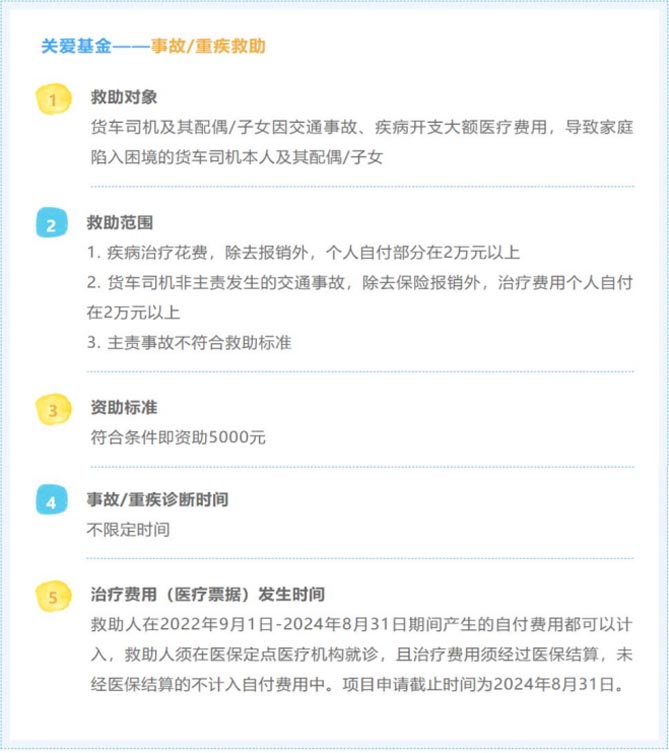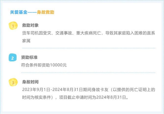 “爱领航”关爱基金:为因货车司机受灾、交通事故、重大疾病死亡,导致其家庭陷入困境的,一次性提供10000元关爱基金,缓解家庭生活困难。为因卡车司机本人及其配偶/子女交通事故、重大疾病开支大额医疗费用,导致家庭陷入困境的,一次性提供 5000元关爱基金。