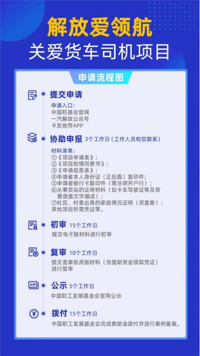1、登录中国职基会官网官微、一汽解放公众号或卡友地带APP,申请解放爱领航·关爱货车司机项目,申请者在确认符合条件后填写申请信息并确认提交;