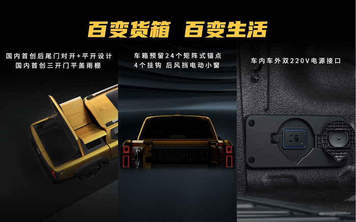 百变的越野玩法,同样离不开百变的越野功能加持,无论是最大拖拽3.3吨,具备C6拖挂认证资质的合规拖车能力,还是预留24矩阵式锚点、220V外接电源的露营车潜质,还有那开放式百变后车箱,国内首创平开+对开式后尾门、三开门平盖雨棚……山海炮性能版既能硬撼极限道路,也能贴心呵护主人,享受皮卡车生活的百种模样。
