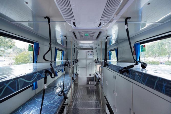 休息舱设置上下双层床铺,铺长大于2米,每个床铺均配备2根安全带,防止人员、物品等坠落,车内配置两套独立的供电系统——220V交流电系统和24V直流电系统,每个床铺均配备独立插座,可以为手机、平板电脑等充电,满足测井人员生活用电需求。车内还单独配备220V驻车空调和电取暖器,保证休息时提供温馨如家的休息环境。休息舱顶部设置晾衣绳固定支架,解决人员易晾衣问题。