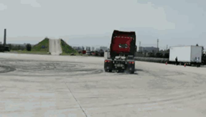 ①考验底盘稳定性。大家一定对专业赛车手,或者影视剧中常出现的漂移不陌生,多数人会认为这首先是车技了得,其次就是车辆品质杠杠的。没错,陕汽重卡特技队这次特意用陕汽普通的6×4牵引车(经简单改装)表演了一把漂移。180度、360度,单侧漂移、连续左右画出8字的漂移,精彩至极。中国物流商用车专家顾问委员会的专家看得入了神,为陕汽重卡的出色表现竖起了大拇指。