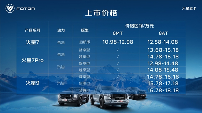 雪域盛开格桑花,火星皮卡世界之巅三箭齐发。为持续推动福田皮卡业务乘用化转型升级及持续增长,火星皮卡进一步完善产品矩阵,携火星9汽油版、火星7Pro柴汽油版、火星7柴油启航版三款产品在世界之巅珠峰正式上市。火星9汽油版价格14.78万-18.18万,火星7Pro汽油版价格12.98万-15.48万,此次上市的火星皮卡汽油版车型不仅匹配245马力+采埃孚8AT澎湃动力,全系更标配多连杆后悬+电动助力转向,瞄准乘用市场以乘用化和高端化加速市场高品质增长;同时火星7Pro柴油版价格13.68-16.18万,动力仍采用行业首创柴油混动系统,综合扭矩达450牛米,全系标配多连杆后悬,驾乘体验再升级。