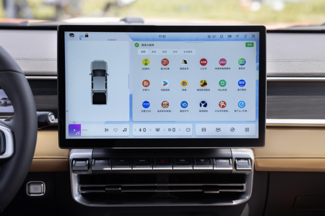 坐进车内前排,威麟 R08 搭载的 15.6 英寸高清大屏虽然已将核心功能统一集成,却还是特意保留了钢琴键式机械按钮 —— 这是对皮卡用户群体的贴心考量:低速通过越野路段时,车辆颠簸摇晃,驾驶者紧盯前方复杂路况,无暇低头操作屏幕。此时,仅凭指尖就能快速盲按机械按钮。这种“功能双选项” 的设计,让不同需求的用户都能找到顺手的交互方式。