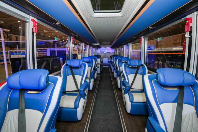 在高端化方面,宇通积极满足美好出行的需求,推出了“金玉满堂、青山碧水”等获得市场认可的高端内饰产品,今年推出的全新高端车型宇通天域S12,更凭借102项专利技术刷新行业纪录,推动客车行业的高端化进程不断加速。