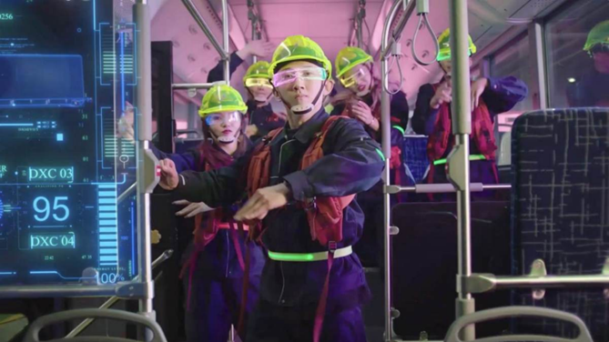 开篇一个散发神奇光芒的能量球飞入屏幕,在高科技的智能生产线旁,一群年轻工人受到了它的催化,摇身一变成为时尚前沿的派对玩家,在工厂内开起了“派对”,和机械臂一起劲舞。