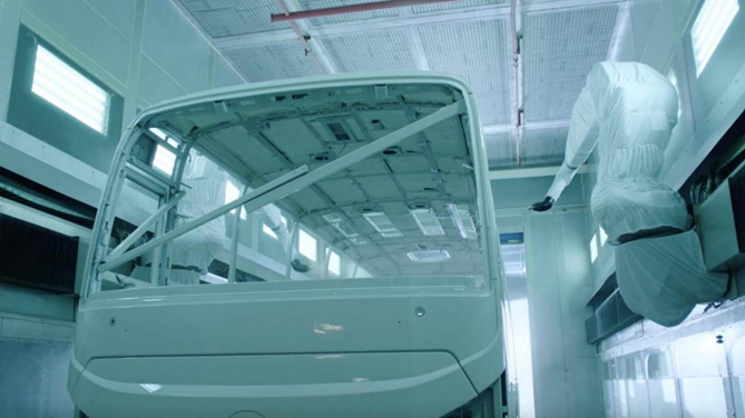 随着节奏的推进,一部部崭新的客车生产下线,在激昂的音乐下,年轻人们围绕着客车开始了一场特殊的足球赛。