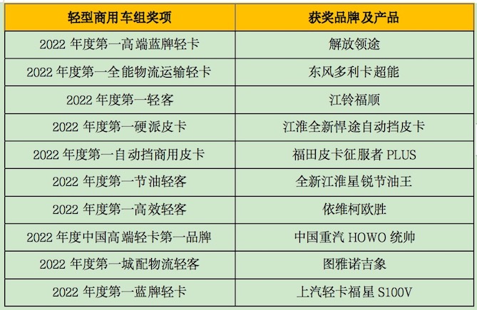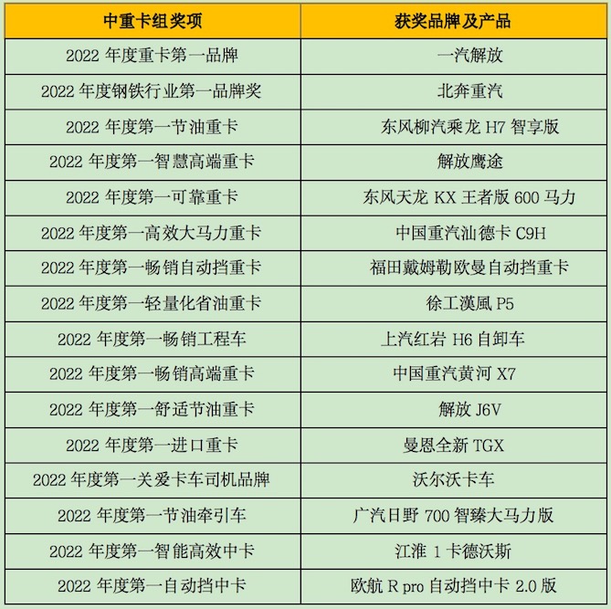 此外,为推动商用车行业加速向新能源方向发展,今年的新能源组评选设置了“2022年度第一畅销换电重卡”、“2022年度第一推荐新能源物流车”、“2022年度第一高效新能源轻客”、“2022年度第一节能新能源轻卡”、“2022年度第一畅销纯电动矿卡”、“2022年度第一氢能冷藏车”、“2022年度第一新能源公交车”和“2022年度第一续航新能源物流车”等奖项。在零部件领域,本次评选设置了“2022年度第一新能源动力总成品牌”、“2022年度第一懂中国卡友的AMT”、“2022年度第一畅销蓝牌动力”、“2022年度第一畅销重卡动力”、“2022年度第一可靠中卡动力”、“2022年度第一高效蓝牌动力”、“2022年度第一节油动力”、“2022年度第一轻量化动力”等重磅奖项。