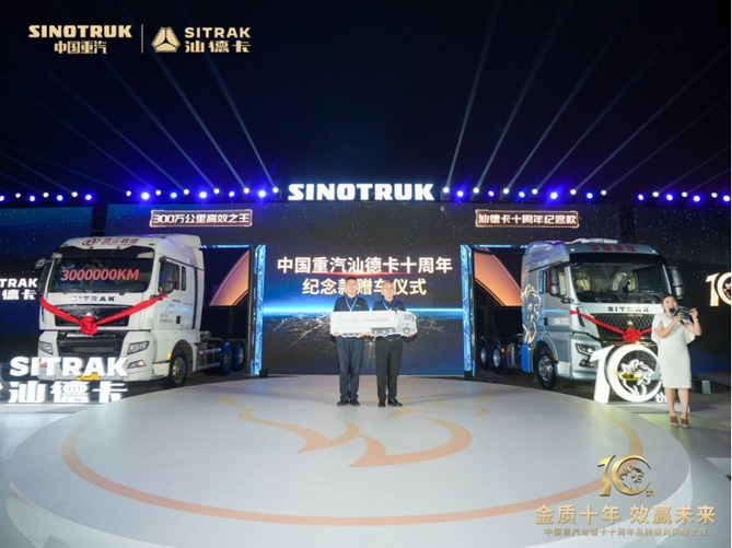2023年4月26日,付忠艳的传奇汕德卡达成300万运营里程,恰逢中国重汽汕德卡上市十周年,他将这辆“传奇”汕德卡作为一份特别的“庆生贺礼”赠送给中国重汽,而中国重汽则将全球第一辆汕德卡十周年纪念款C9H赠予付忠艳,以进阶品质共赴更加令人欢欣鼓舞的新十年,象征着汕德卡与功勋客户“永以为好”,被行业引为佳话。