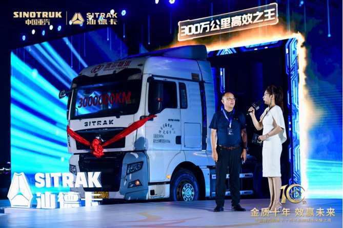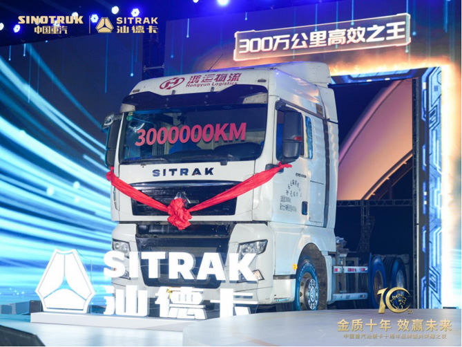 一辆重卡的最长运营里程是多少?中国重汽汕德卡率先交卷!2023年4月26日,一辆于2014年投入运营的汕德卡C7H达成300万运营里程,标志着中国重汽汕德卡创下中国高端重卡运营“高效之最”。2023年7月2日,“金质十年 效赢未来 中国重汽汕德卡十周年品牌盛典荣耀之夜”在青岛圆满举办,这辆富有传奇色彩的汕德卡荣耀亮相,一展中国智造风采,以高效全勤品质令现场嘉宾与线上700万网友叹为观止,强悍实力铸就中国高端重卡之典范。