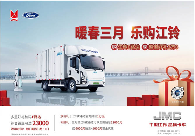 江铃E路达,美好生活全场景专家,它不但具有省心省钱的可靠品质,还拥有亮丽的外观,智能舒适的内饰配置,强劲的动力,安全的保障,个性便捷的售后服务。这样一款集诸多优秀品质于一身的纯电动轻卡标杆产品,在暖春三月多种优惠的购置成本和全年经济实惠的用车本加持下,可帮用户节省出几万元。买纯电动轻卡,就选江铃E路达,它助您在新的创富运输中再创新高。